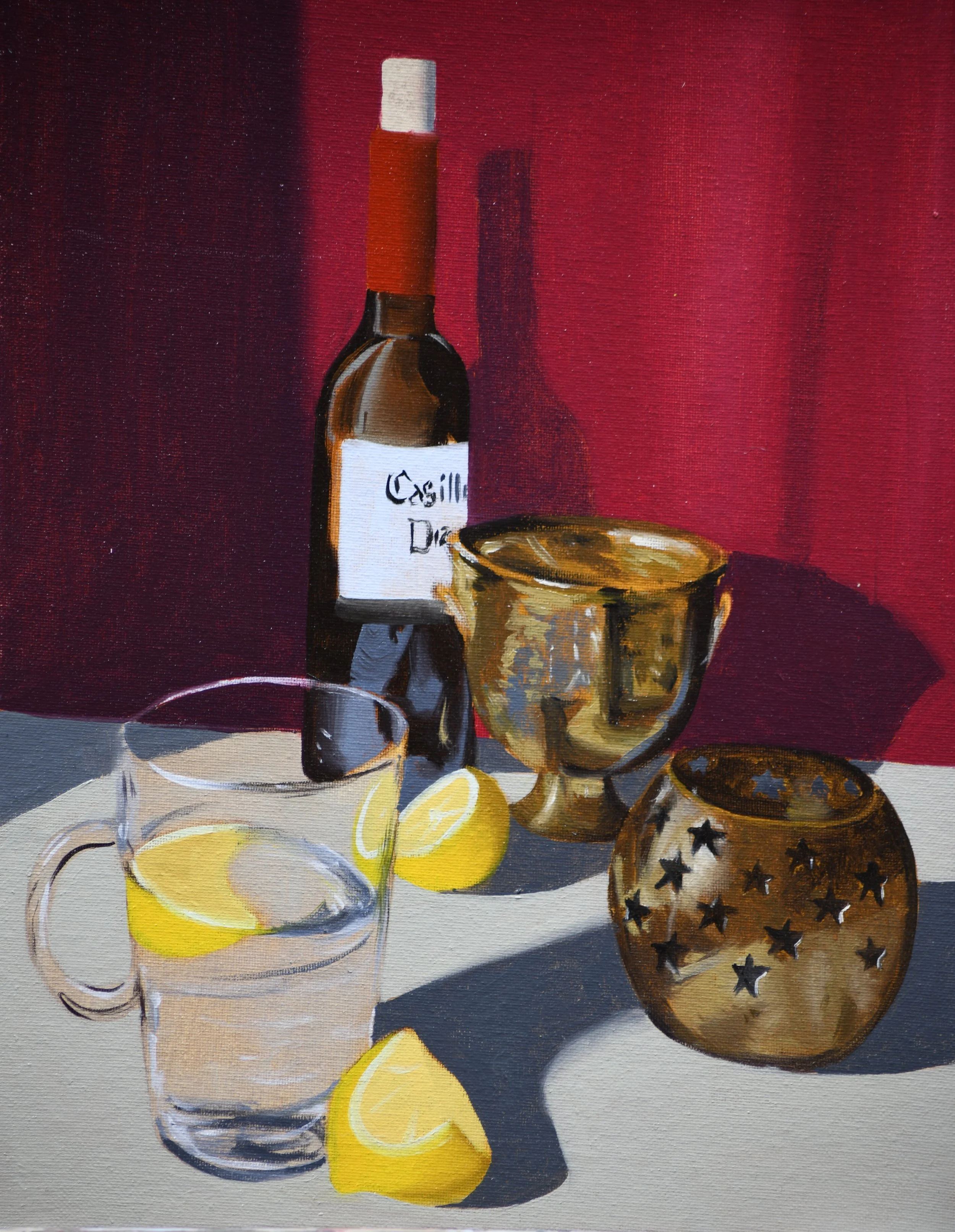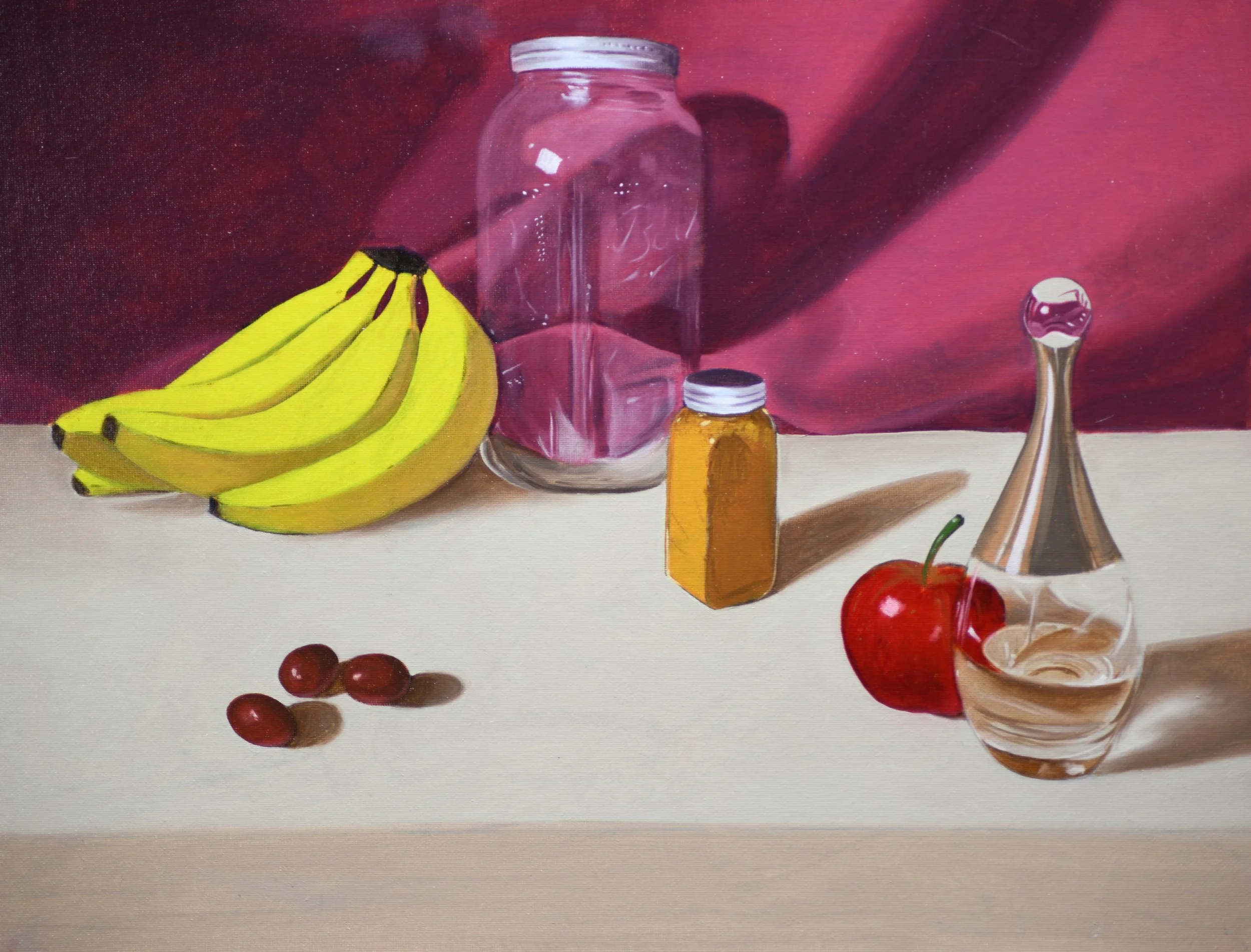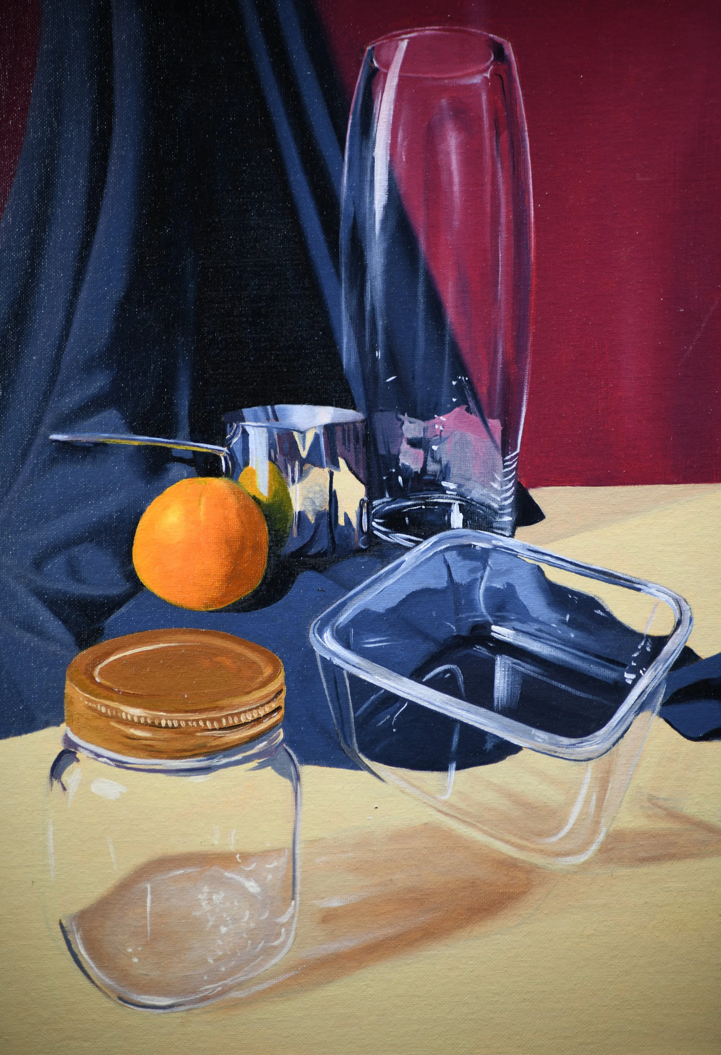 Title:Glass, metal and Fabric Study Description: Oil on Canvas 14”x18” Category: Still-Life Painting